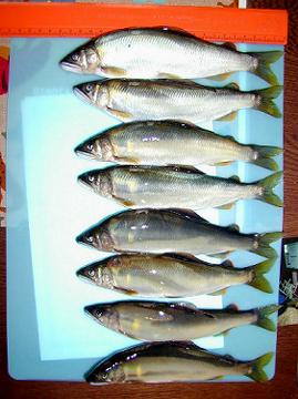 小見橋下の堰堤で20匹。サイズは、20センチから15センチ。レギュラーサイズは、18前後。今まで荒川は釣りにならず、つい数日前も大水で垢が流されたようだが、流芯の方がよかったそうです。周りの人も結構ぽつぽつとあがっているようで、今後川の状態がよくなれば期待できそうです。