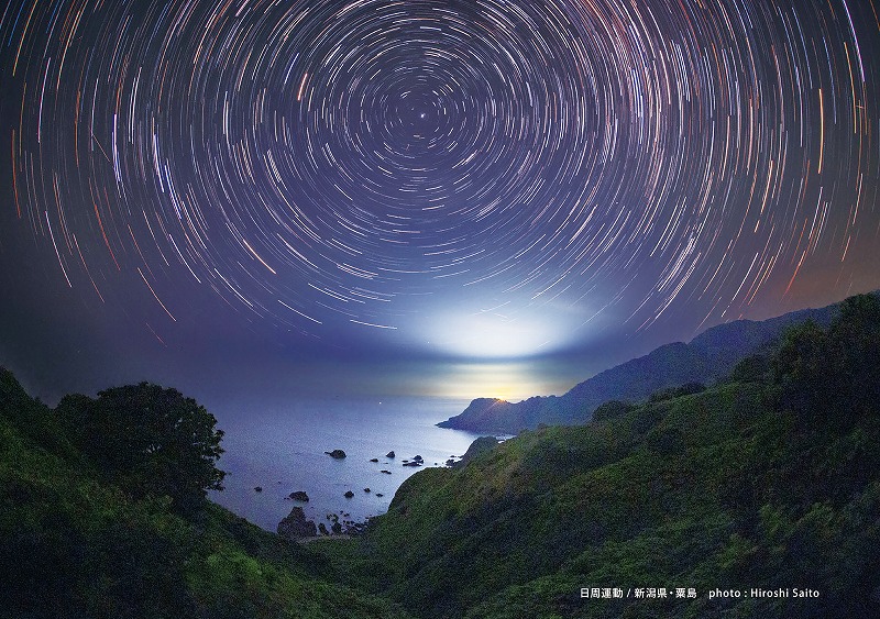 ![]() 10月 日周運動 / 新潟県・粟島周囲約23kmの粟島は、外灯が少なく星見に恵まれた環境だ。西側の断崖と海原がつくる広い視界の下、夜の撮影中には海鳥・オオミズナギドリの声が静かな波音に混じって聞こえてくる。 |