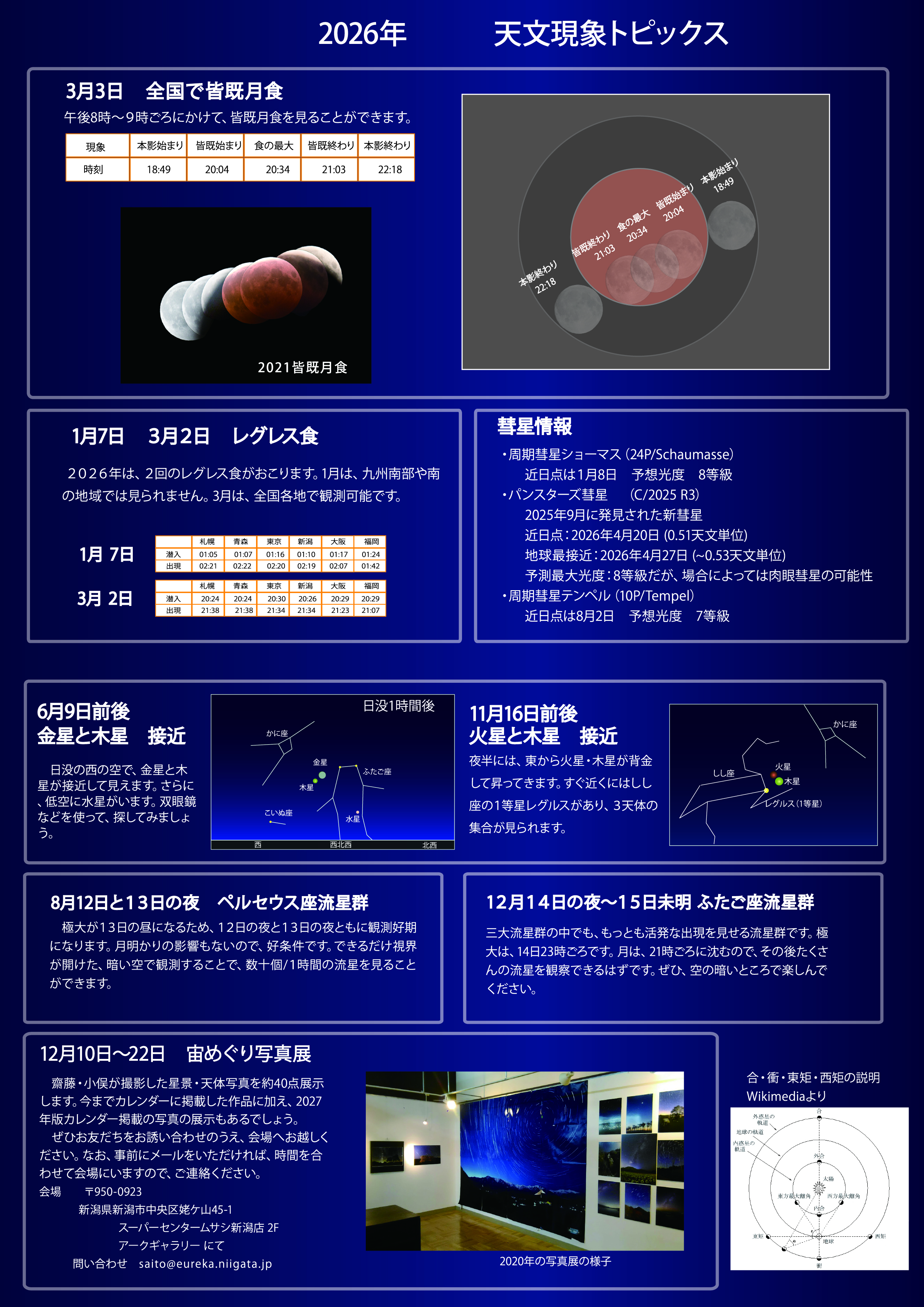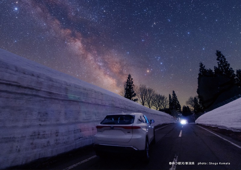 ![]() 2月 春待つ銀河 / 新潟県雪深い越後の山奥の道路脇にはまだ高く積もった雪の壁が残り、春の訪れが遠く感じられる。しかし澄んだ夜空には銀河が鮮やかに広がり冬を越えた大地に少しずつ春の星光が差し込んでいた。 |