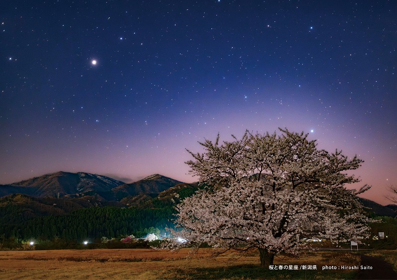 ![]() 4月 桜と春の星座 / 新潟県昇りはじめの月光が大気で赤く和らぎ、桜の周囲をほのかに照らし、桜を浮かび上がらせる。左の明るい星はうしかい座のアルクトゥールス、桜の真上に輝くのはおとめ座のスピカ。夜空と花がひとつの場面になった瞬間。