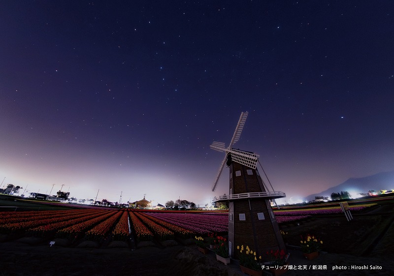 ![]() 5月 チューリップ畑と北天/新潟県五泉市は県内屈指のチューリップ産地。まつりの会場に咲き誇る150万本の彩りの上、春の高い空では北斗七星が静かに北極星を指していた。 |