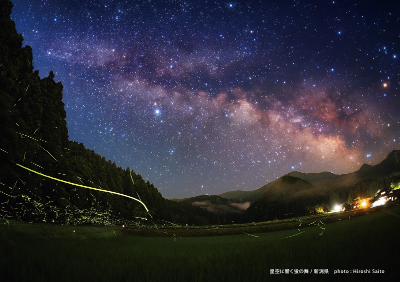 ![]() 6月 星空に響く蛍の舞 / 新潟県今年、偶然たどり着いた小さな谷間。夜空には春の銀河が弓なりにひろがり、田の縁では蛍が光を結ぶ。地上と天の光が交わるこの場所を見つけられて、心からうれしかった。