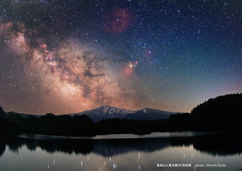 ![]() 8月 鳥海山に昇る銀河 / 秋田県標高2,236mの独立峰を望む小さな湖へ、細道を辿ってゆく。夕暮れが終わるころ、湖面には山の影、続いて星の粒、最後に銀河の帯が順に現れ、夜は一枚の天体画になった。 |